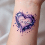 Tetování fialové srdce a srdce a jméno a hvězdičky na předloktí