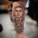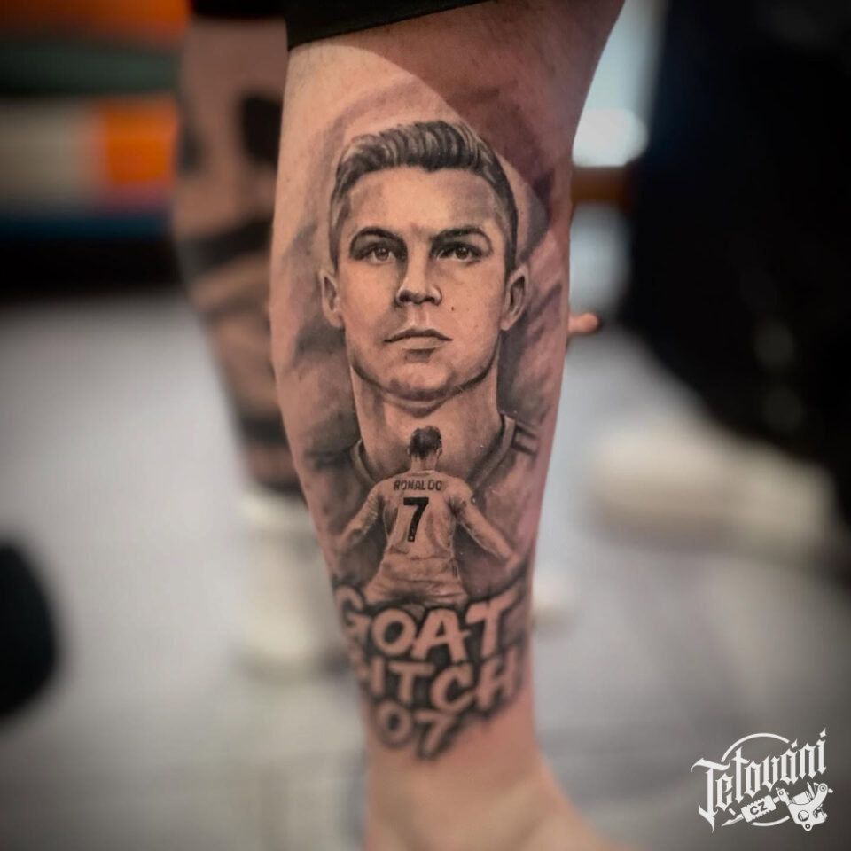 Tetování fotbalové osobnosti, portrét na lýtku