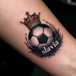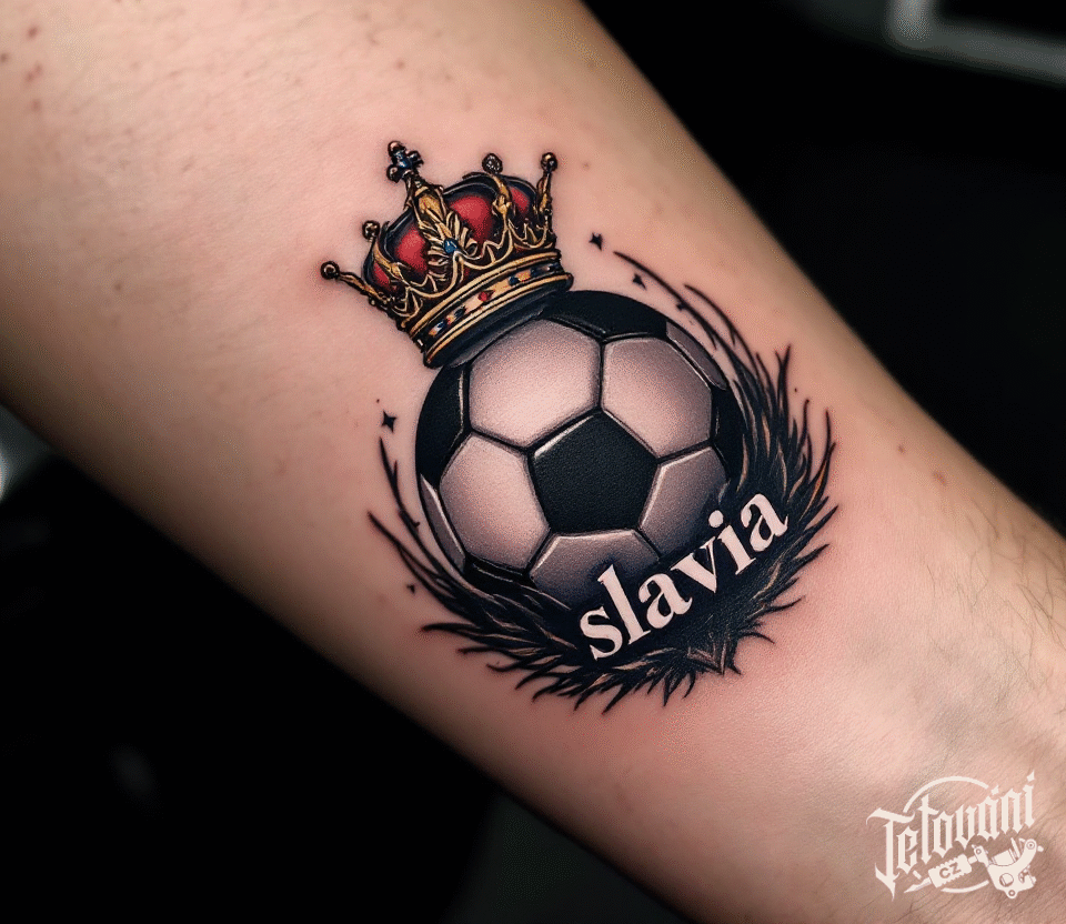 Tetování fotbalový míč Slavia s korunou na předloktí