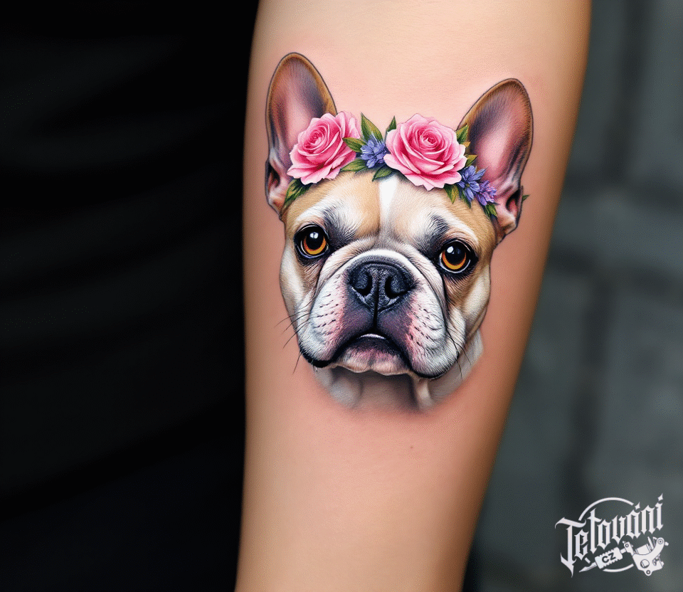 Tetování francouzský buldoček s květinovým věnečkem na předloktí