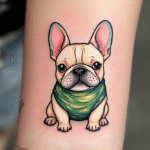 Tetování francouzský buldoček se zeleným šátkem na předloktí