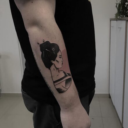 Tetování gejša, pták, anime portrét na zádech