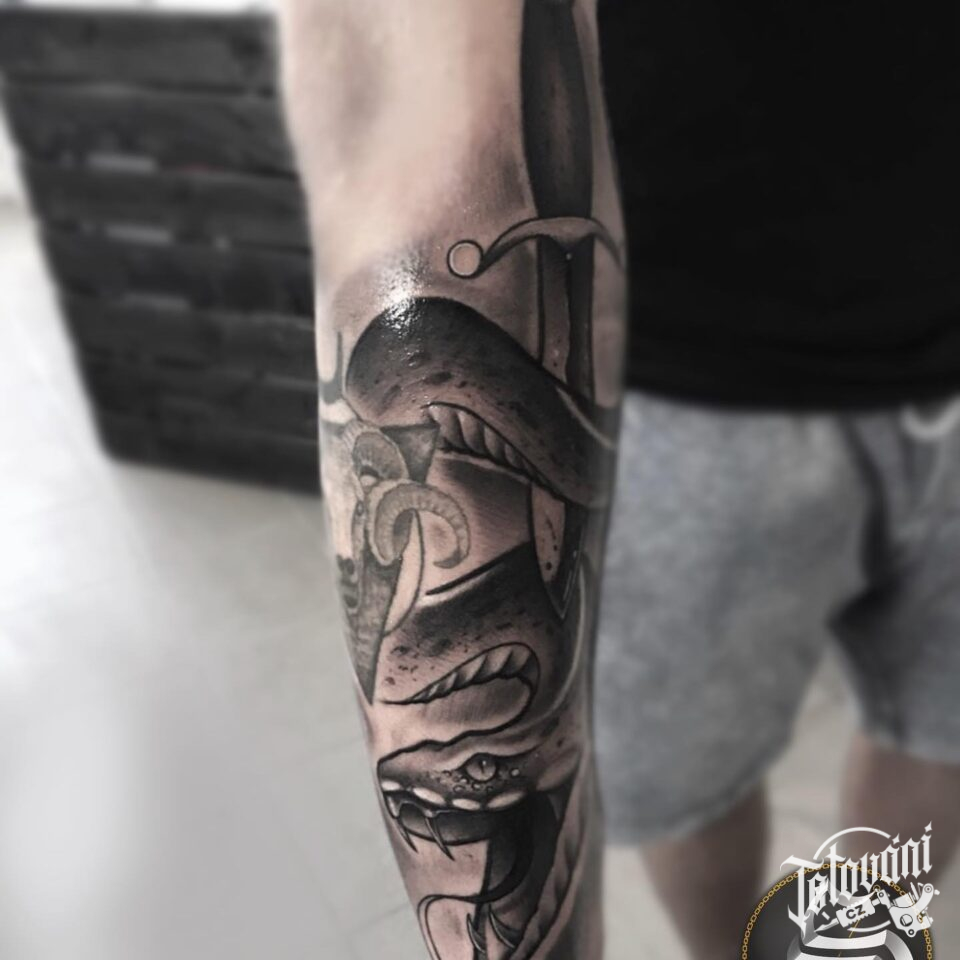 Tetování had a meč na předloktí