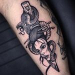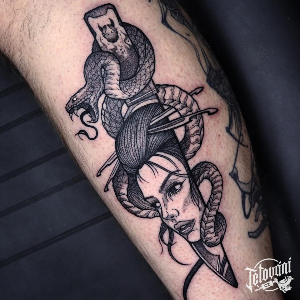 Tetování had, portrét, nůž na předloktí