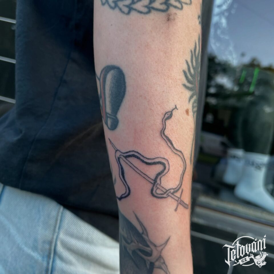 Tetování had probodnutý mečem na předloktí
