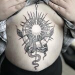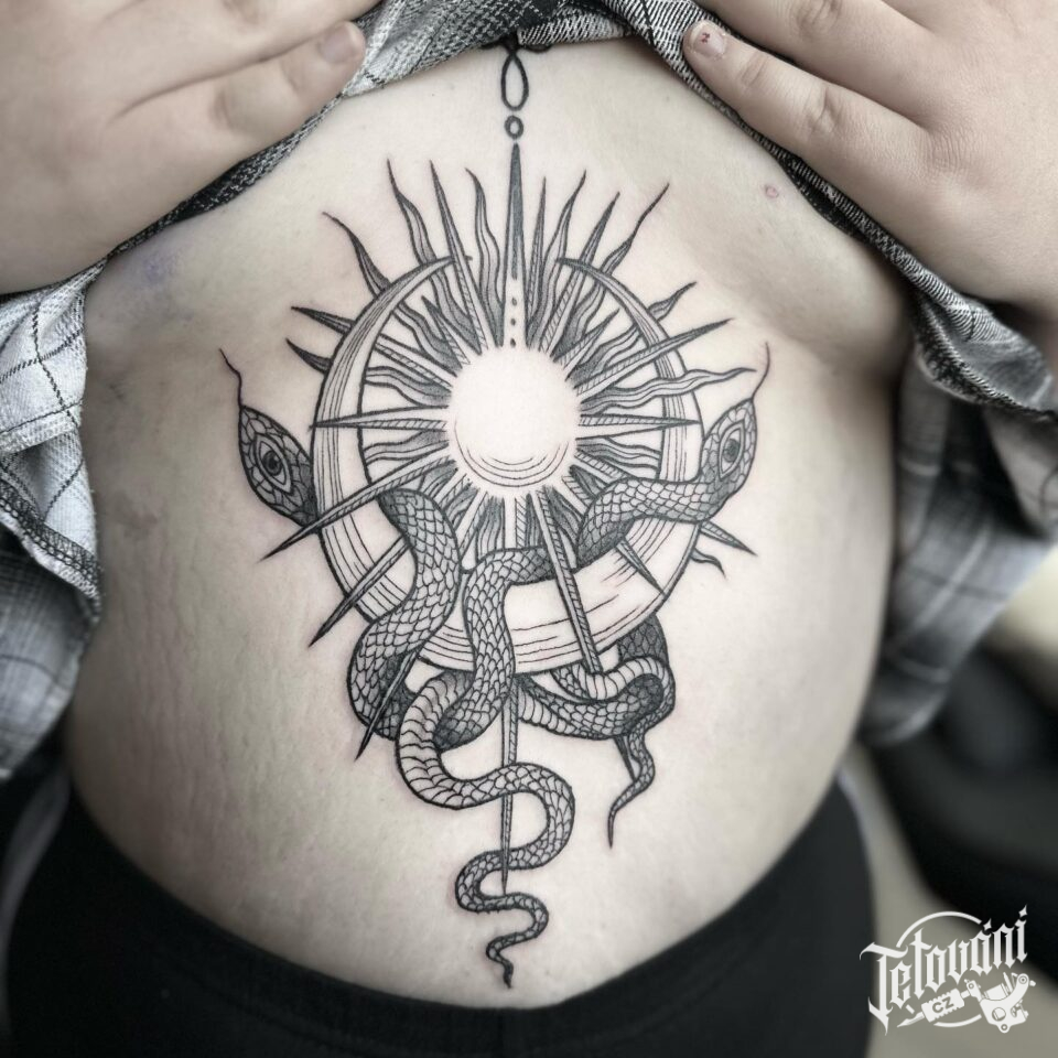 Tetování hadi, měsíc, slunce, zvířata na břicho