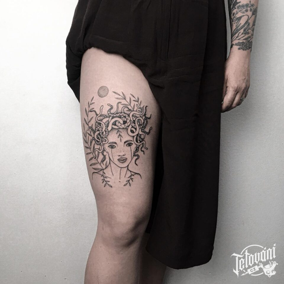 Tetování mýtická bytost Medúsa, žena, hadi, zvířata na stehno