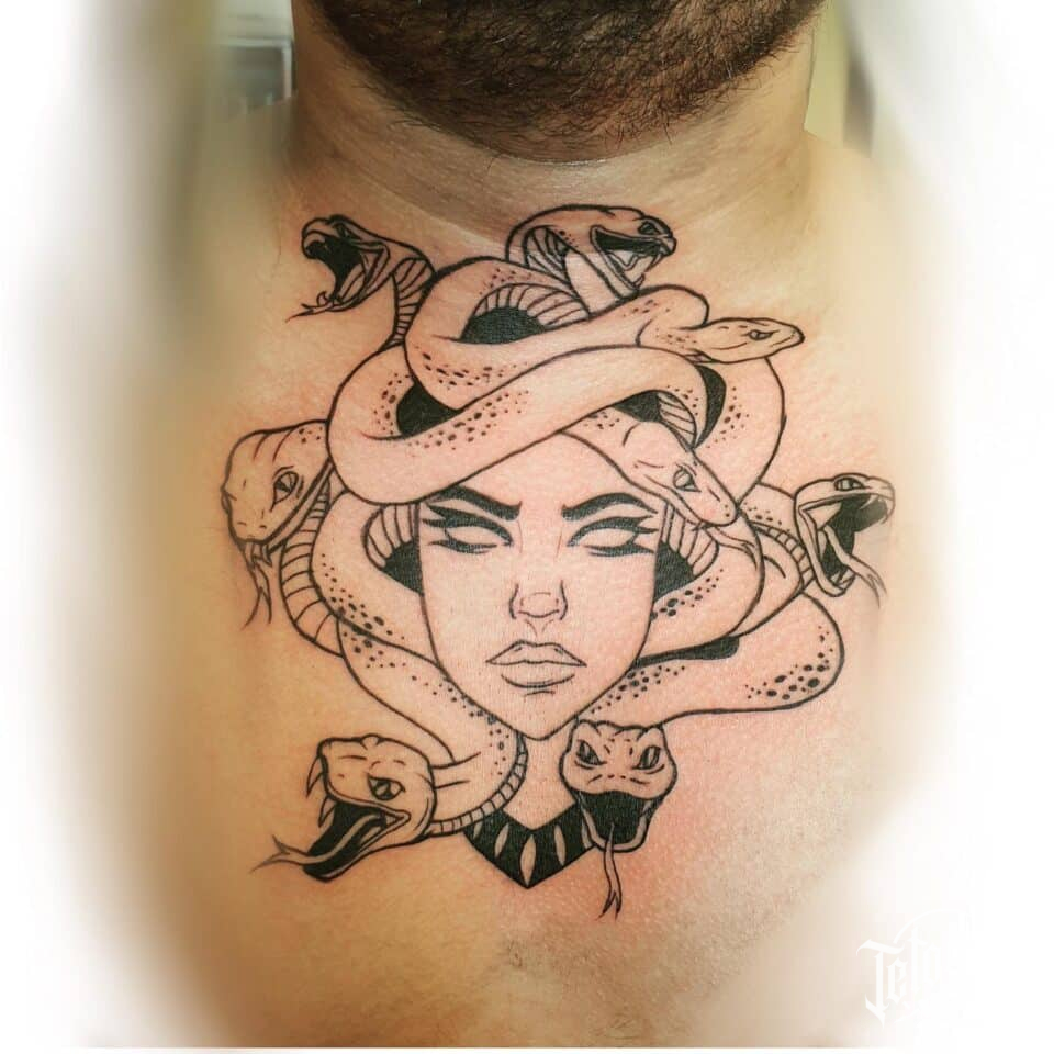 Tetování mýtická bytost Medúsa, hadi, žena, zvíře na hrudník