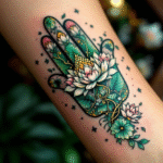 Tetování hamsa s květinami lotos na předloktí