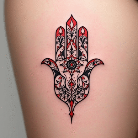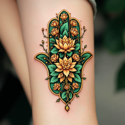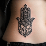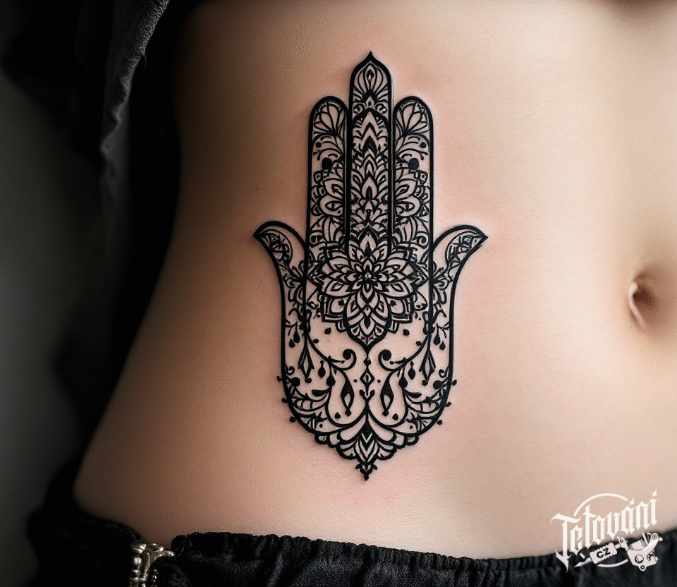 Tetování hamsa s mandalami na břichu