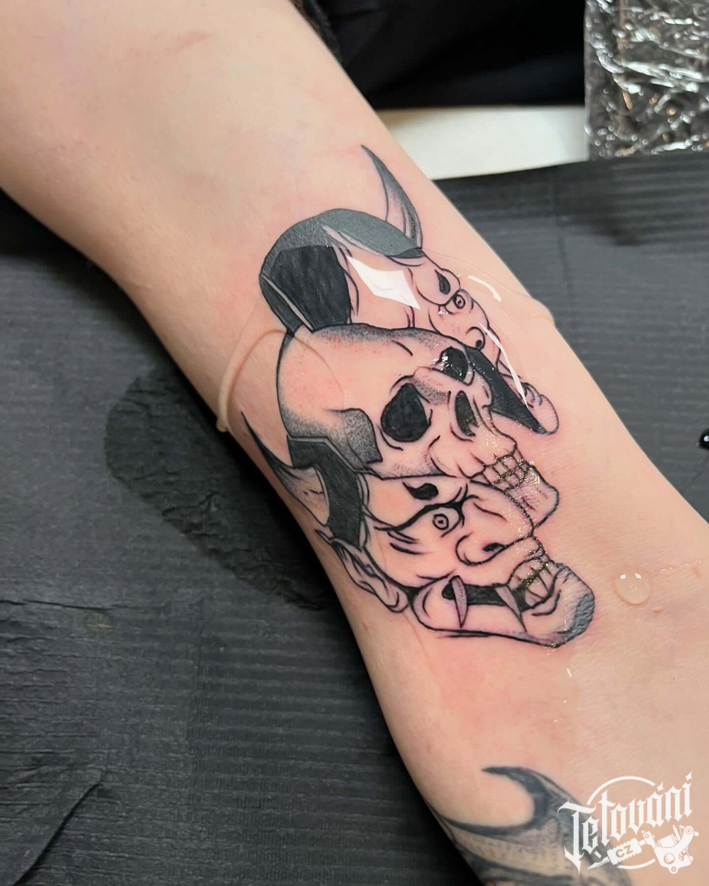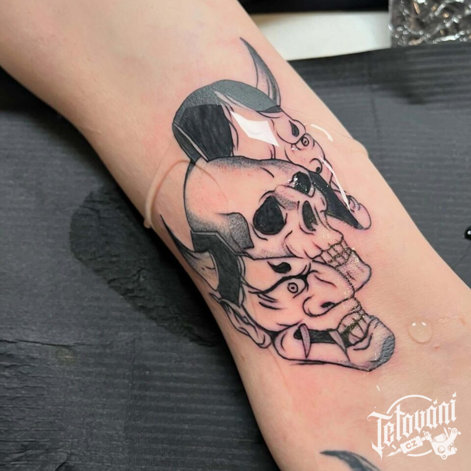 Tetování Hannya maska a lebka na předloktí
