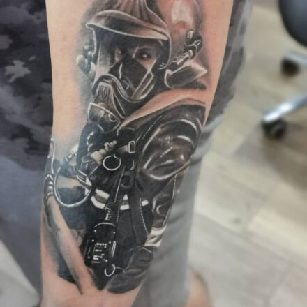 Tetování hasič s křídly, symbol ochrany na předloktí