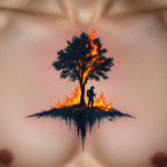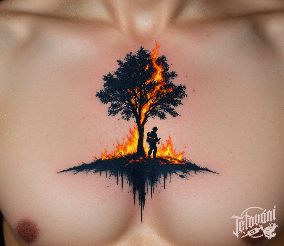 Tetování hasiči, hořící strom na hrudníku