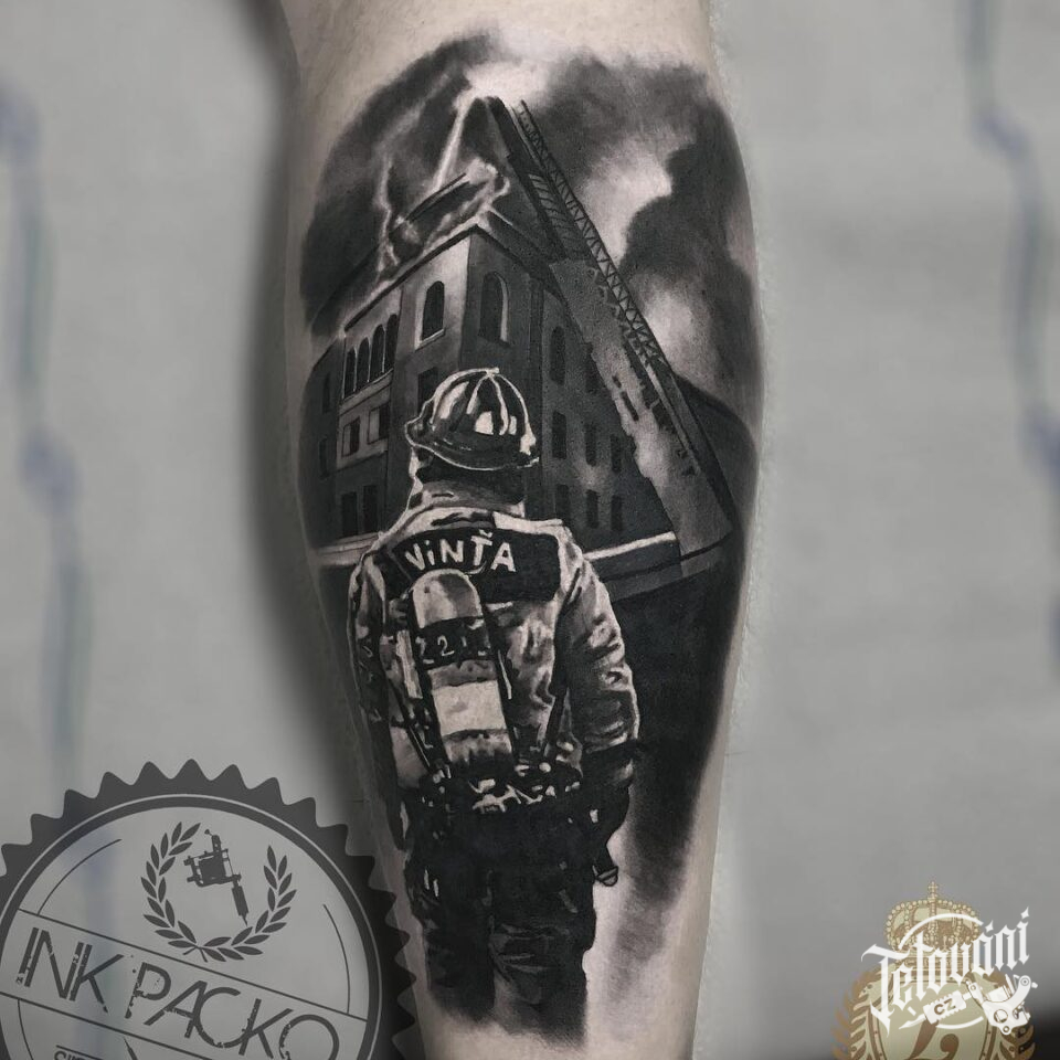 Tetování hasič na lýtku