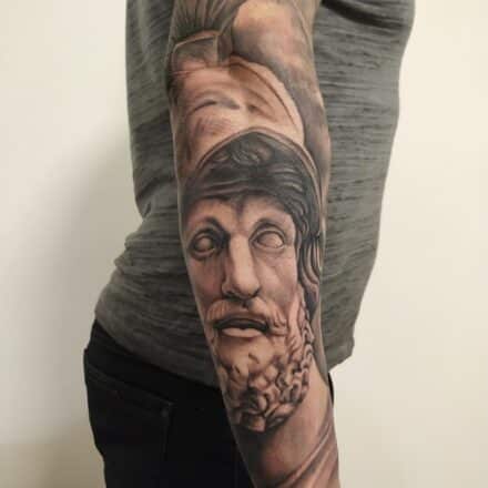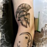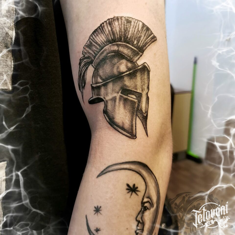Tetování helma sparťanského bojovníka na loket