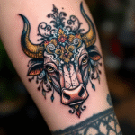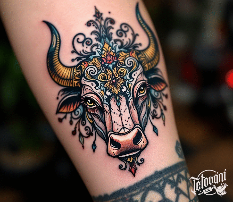 Tetování hlava býka s ornamenty na předloktí