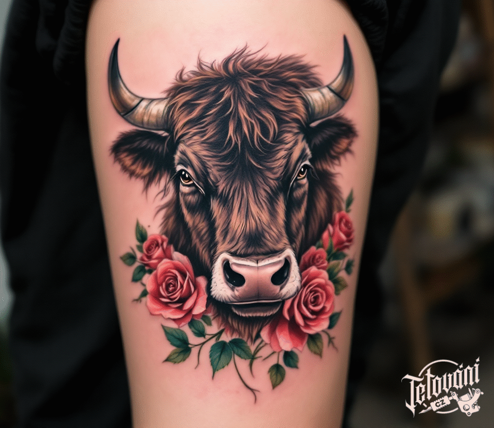 Tetování hlava býka s růžemi na bok stehna