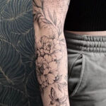 Tetování hlava koně na, květiny pivoňky, ornamenty na ruku