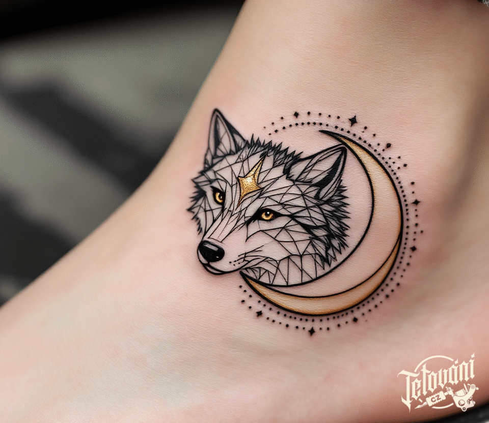 Tetování hlava vlka a Měsíc na kotníku