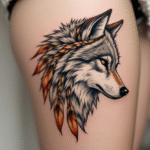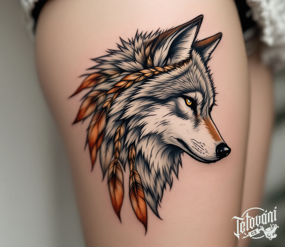 Tetování hlava vlka na bok stehna