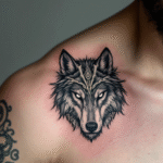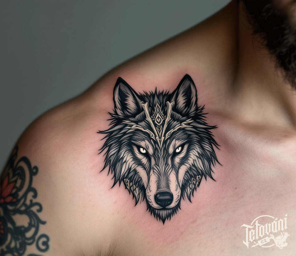 Tetování hlava vlka se symboly na klíční kosti