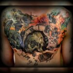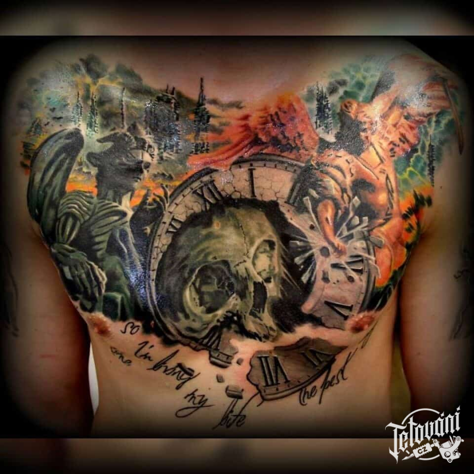 Tetování hodiny a lebka na hrudník