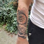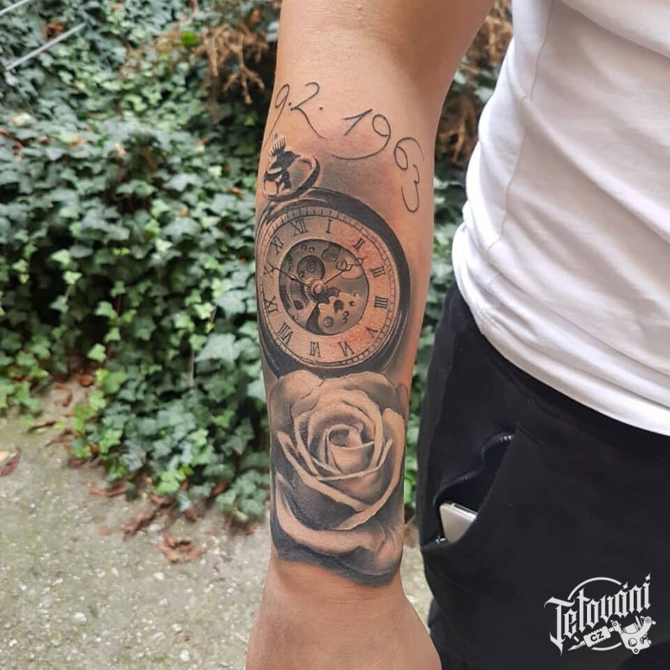 Tetování hodiny a růže, čísla na předloktí