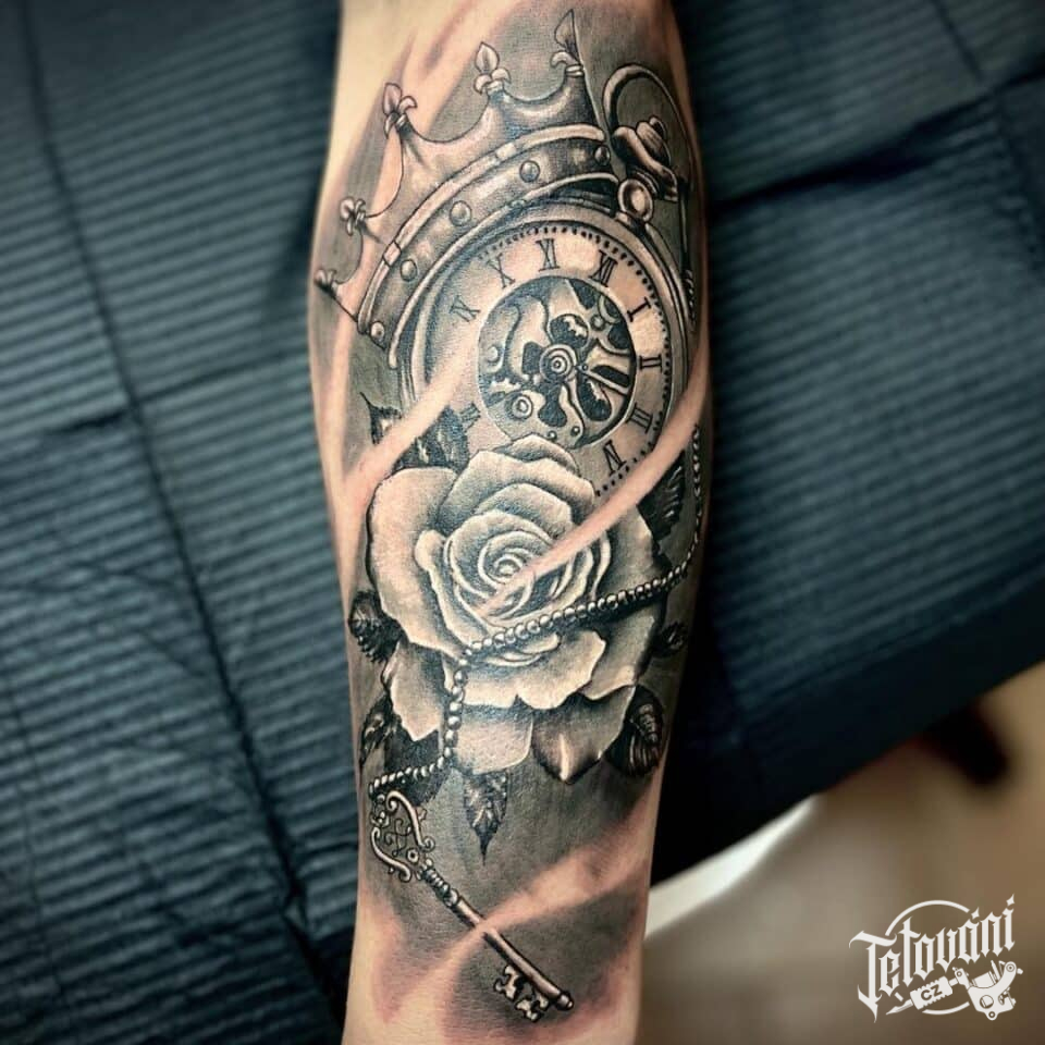 Tetování hodiny a růže, koruna a klíč na předloktí