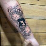Tetování hodiny a růže, koruna, nápisy, jména na předloktí