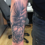 Tetování hodiny a růže, květina a oko na předloktí
