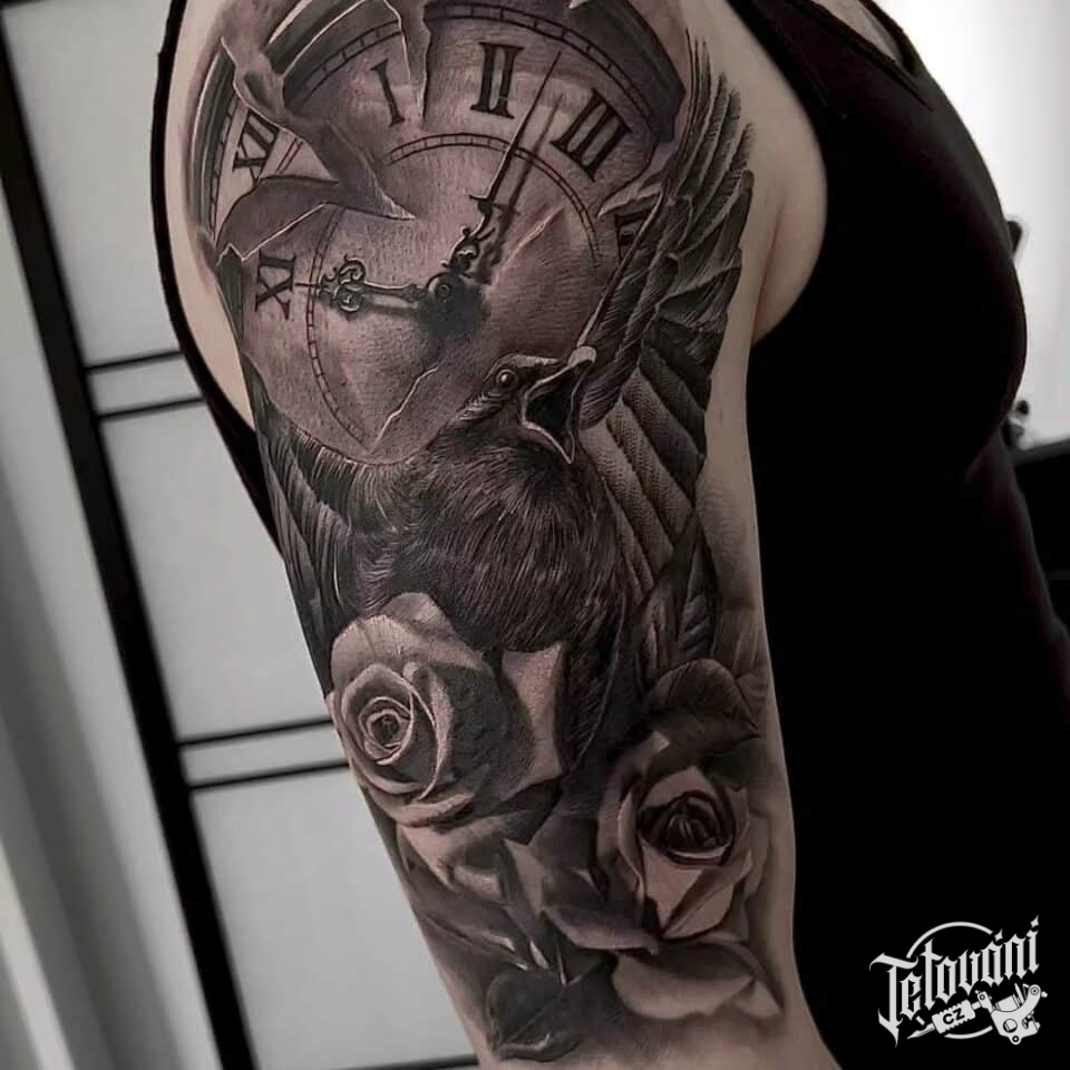 Tetování hodiny a růže na rameni