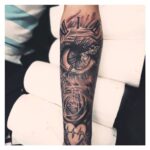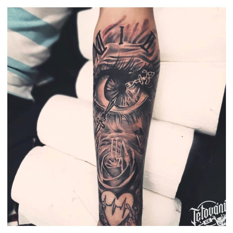 Tetování hodiny a růže, oko na předloktí