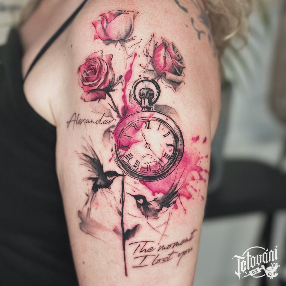 Tetování hodiny a růže, ptáci, nápisy na rameni