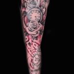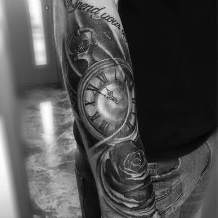 Tetování hodiny a růže, rukáv