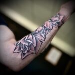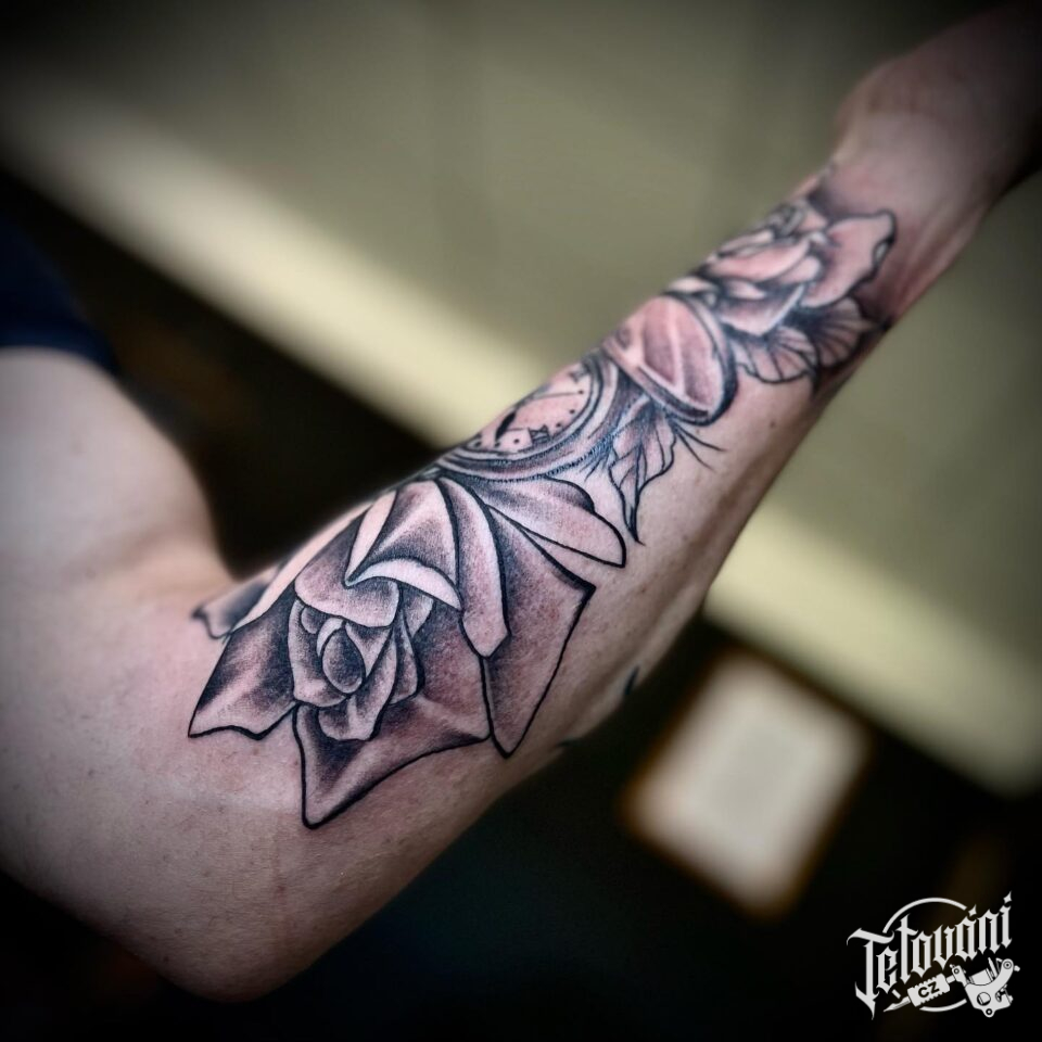 Tetování hodiny, hodiny a růže na předloktí