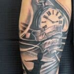 Tetování hodiny, jména, datum a děti na předloktí