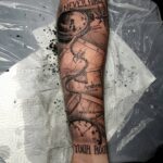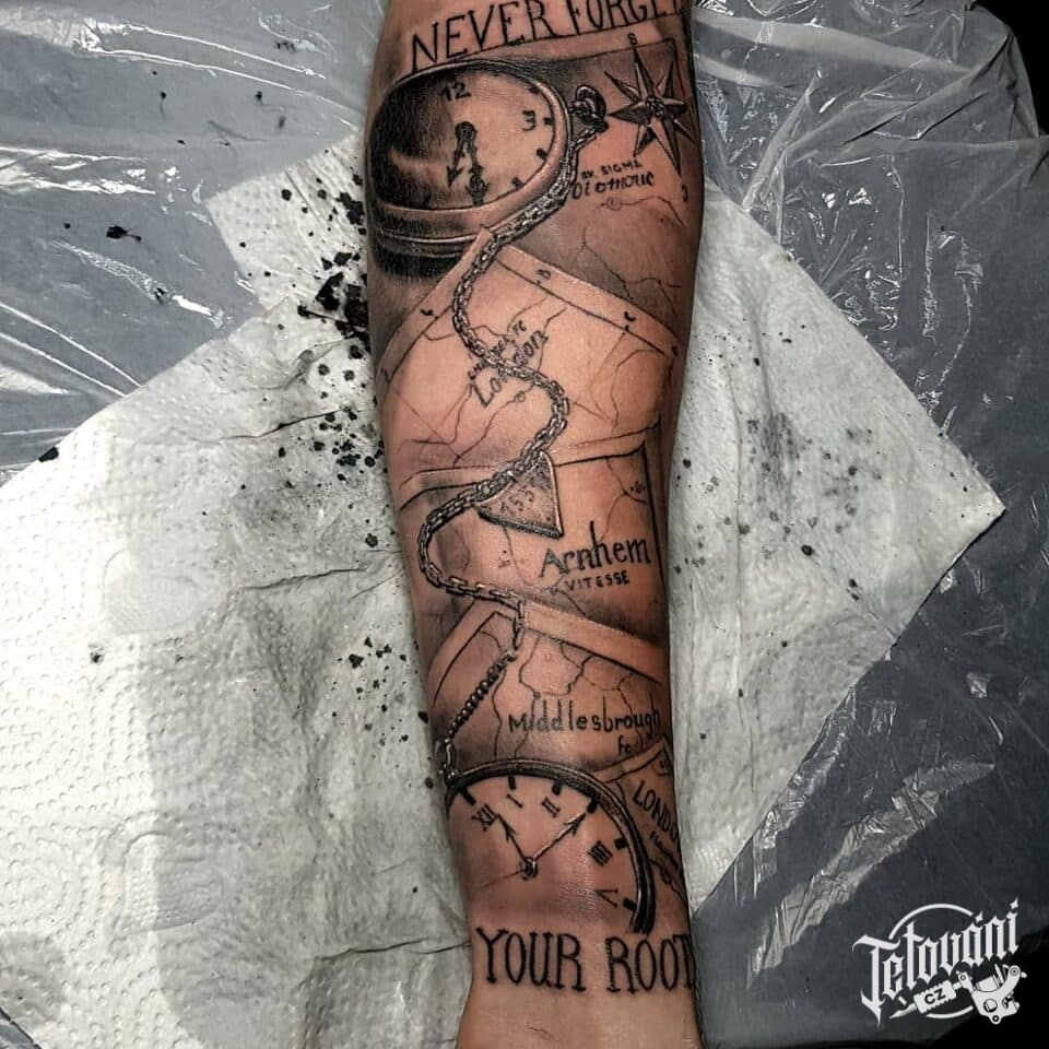 Tetování hodiny kapesní, cestování, mapy na předlotkí