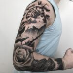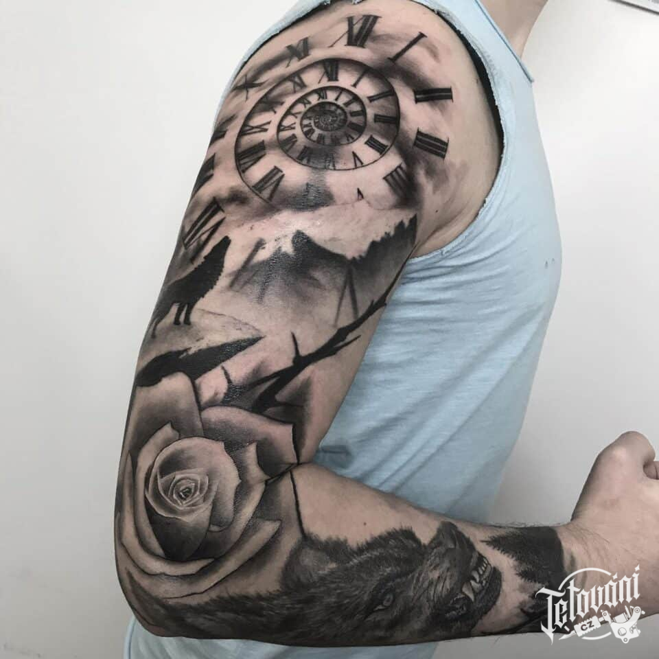 Tetování hodiny, květina růže, zvíře vlk, rukáv