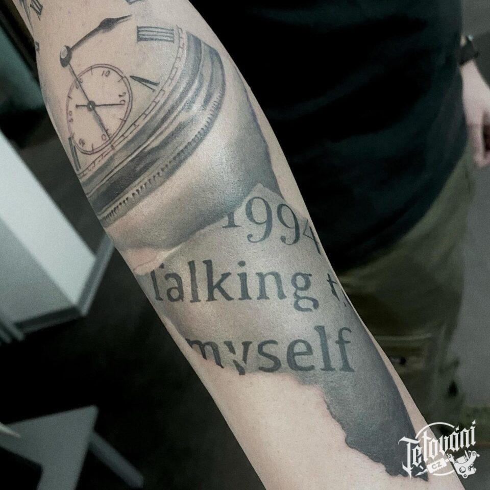Tetování hodiny, nápisy, písmena na předloktí