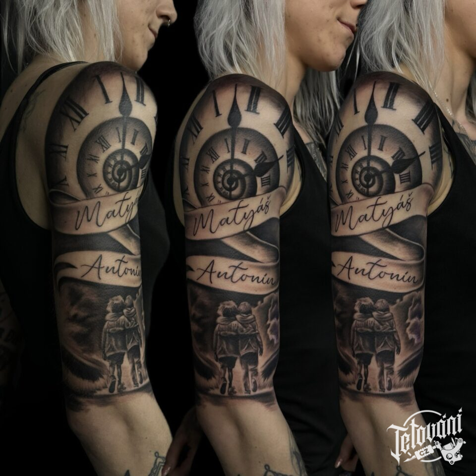 Tetování hodiny, rodina, děti, jména dětí na rameno