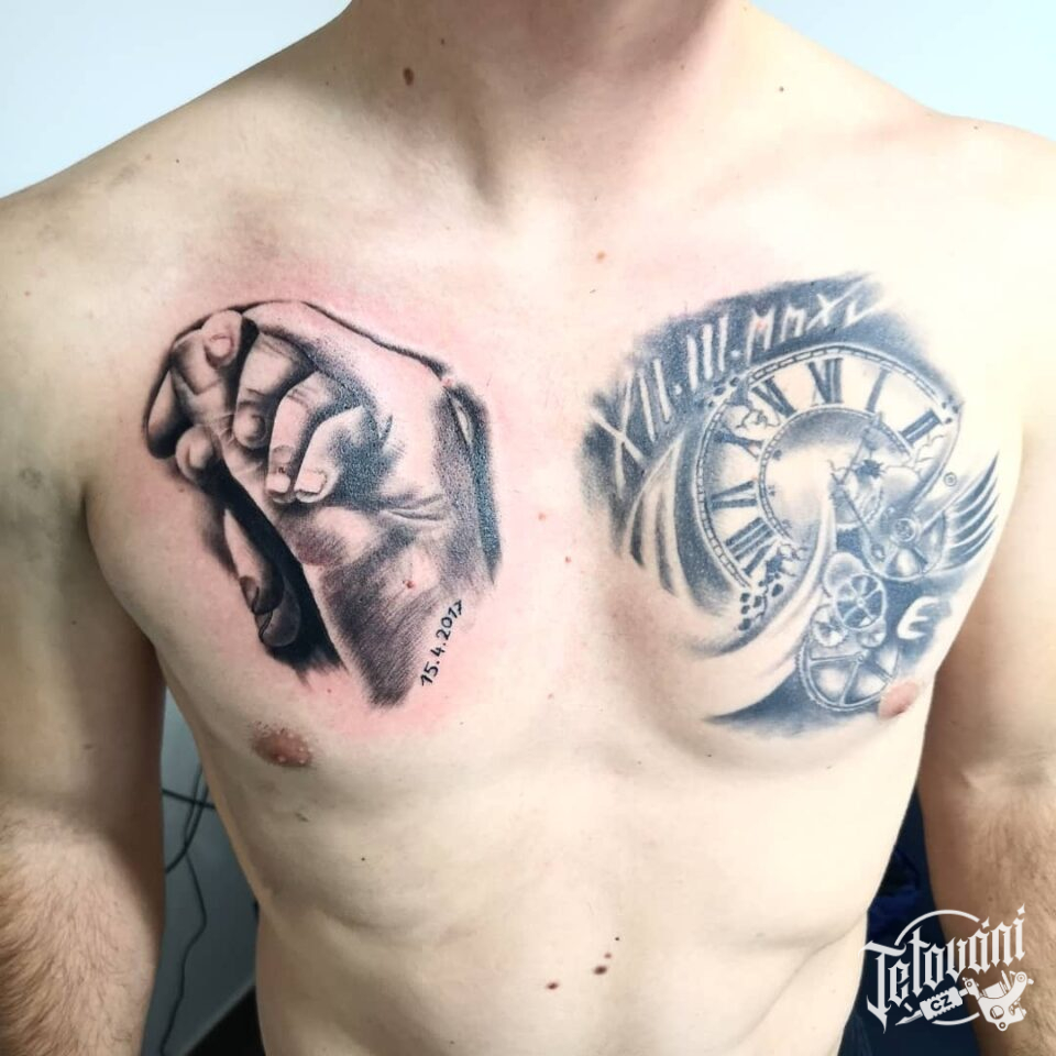 Tetování hodiny, ruce na hrudník