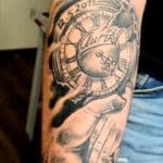 Tetování hodiny, ruce, nápis datum, symbol rodiny na předloktí