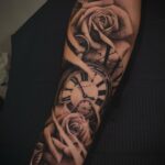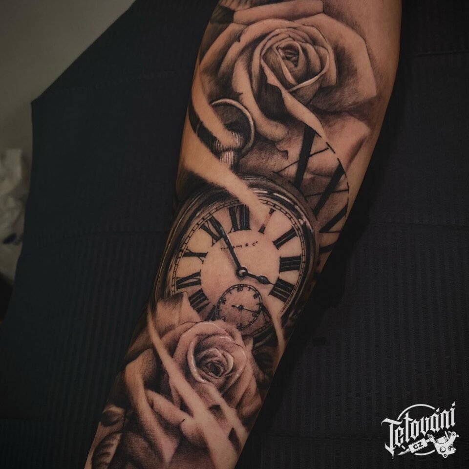 Tetování hodiny, růže na předloktí