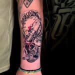 Tetování hodiny z auta, řetěz, symboly na předloktí