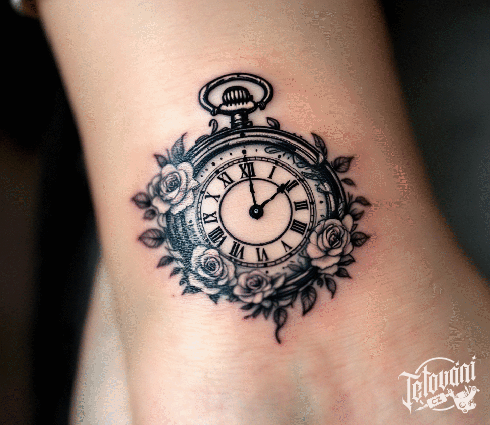 Tetování hodiny života a růže na zápěstí