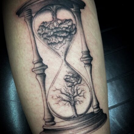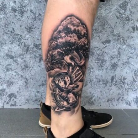 Tetování hodiny života, strom života na boku stehna