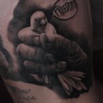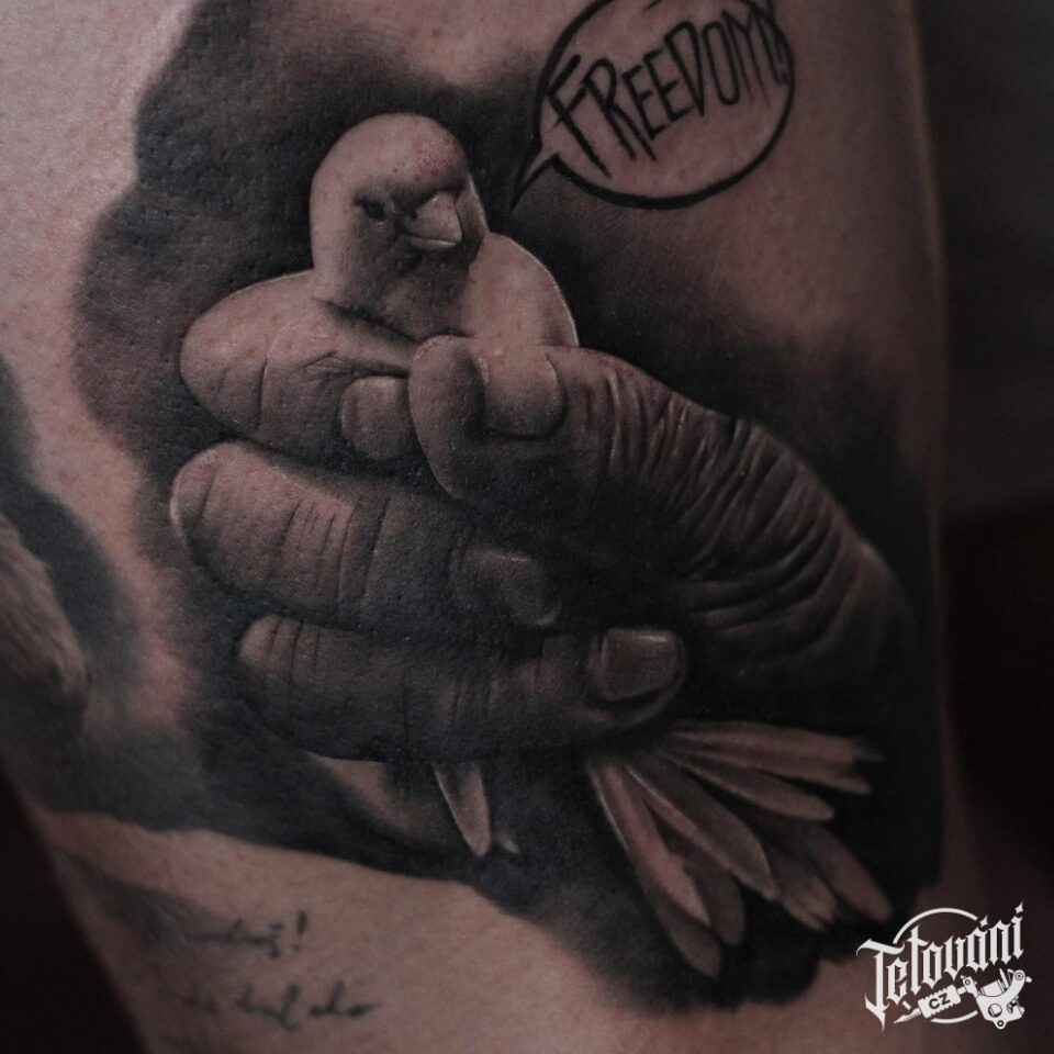 Tetování holubice v ruce, symbol svobody, nápis na stehno