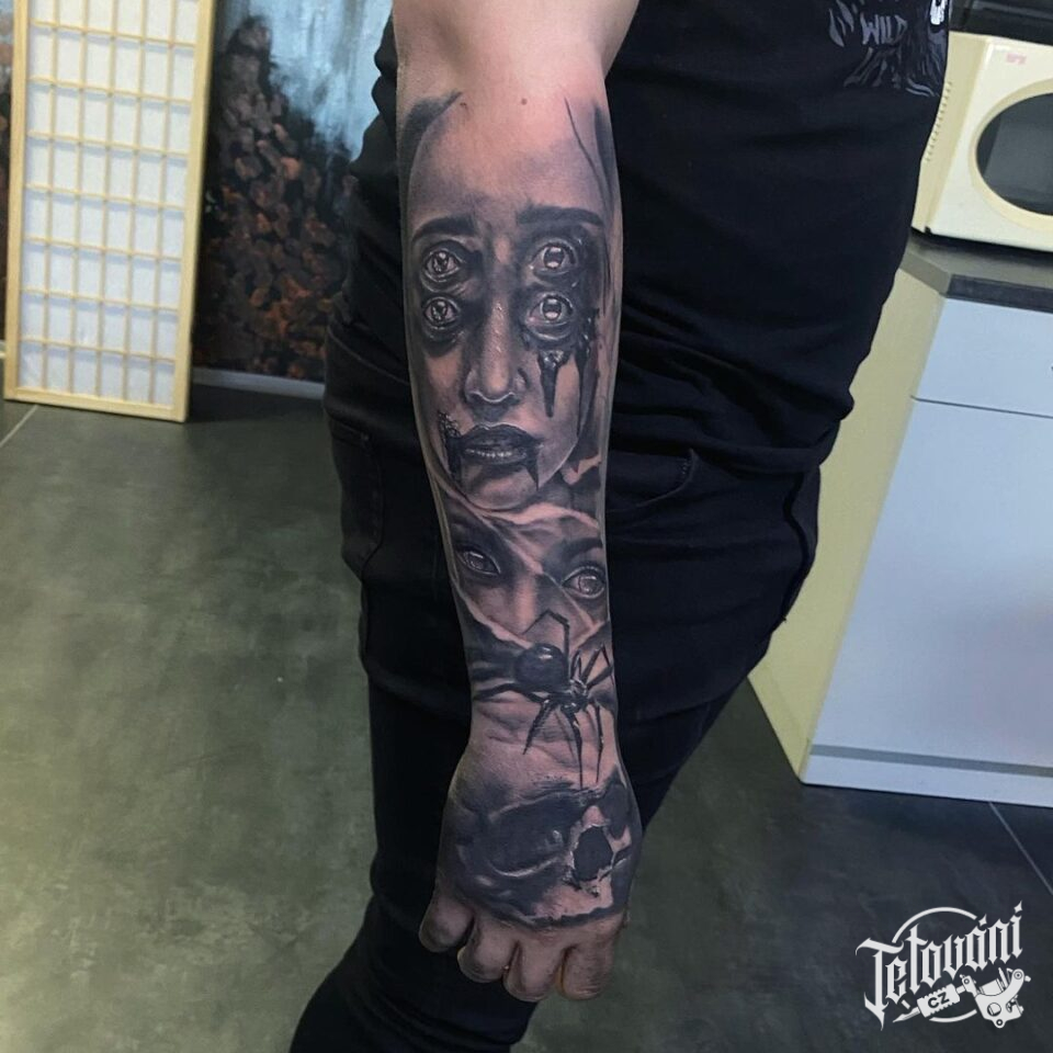 Tetování horror oči, pavouk a lebka na hřbetu ruky