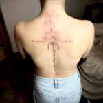 Tetování hory, hvězdy, nápisy, šipky, ornament na zádech