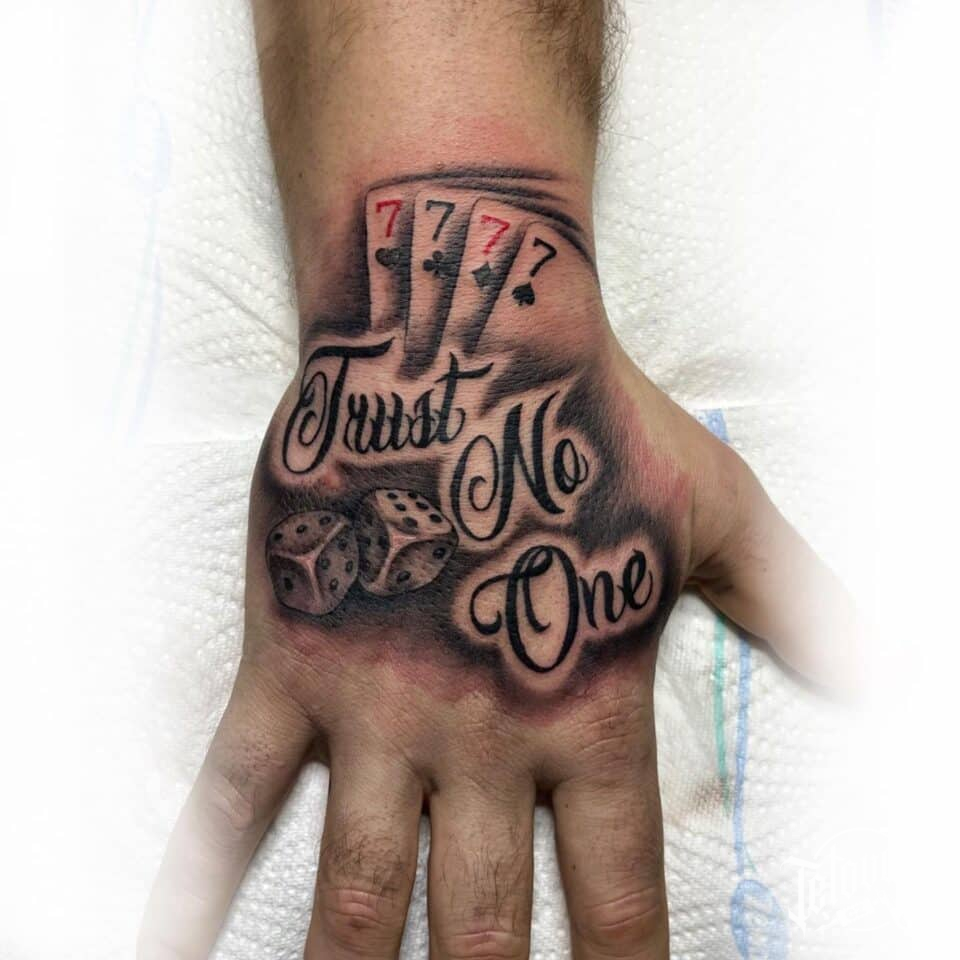 Tetování hrací karty, kostky, nápis na hřbet ruky